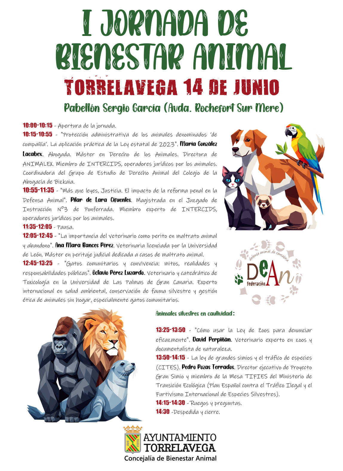 Por su parte, Victoria Cedrún, representante de la Federación DEAN, ha agradecido al Ayuntamiento su apoyo y ha puesto en valor la calidad del programa. “Estamos particularmente orgullosos de contar con ponentes de tan dilatada experiencia y renombre en el ámbito del bienestar animal”, ha dicho, subrayando que se ha hecho un esfuerzo por acercar a la ciudadanía expertos de primer nivel en diversas áreas jurídicas, veterinarias y medioambientales.
