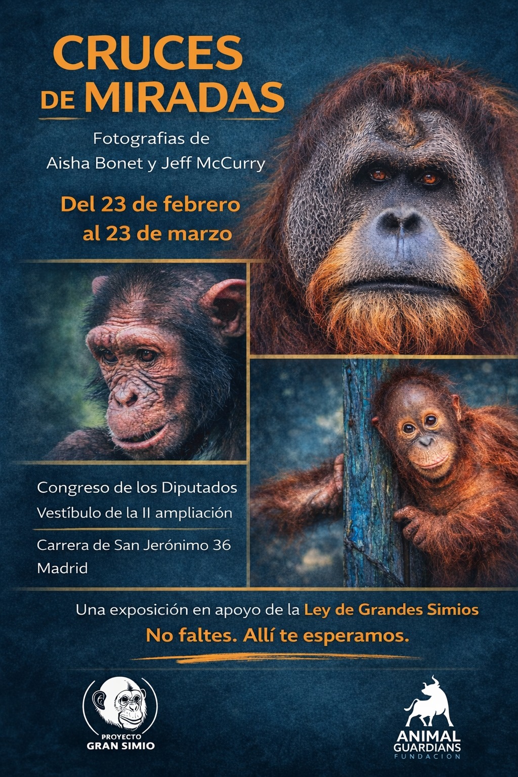 En este contexto, la exposición “Cruces de miradas” cobra aún más sentido. Más allá del debate técnico o político, Proyecto Gran Simio y la Fundación Animal Guardians quieren situar en el centro del debate aquello que da origen a esta ley: los propios individuos, sus miradas y su realidad.