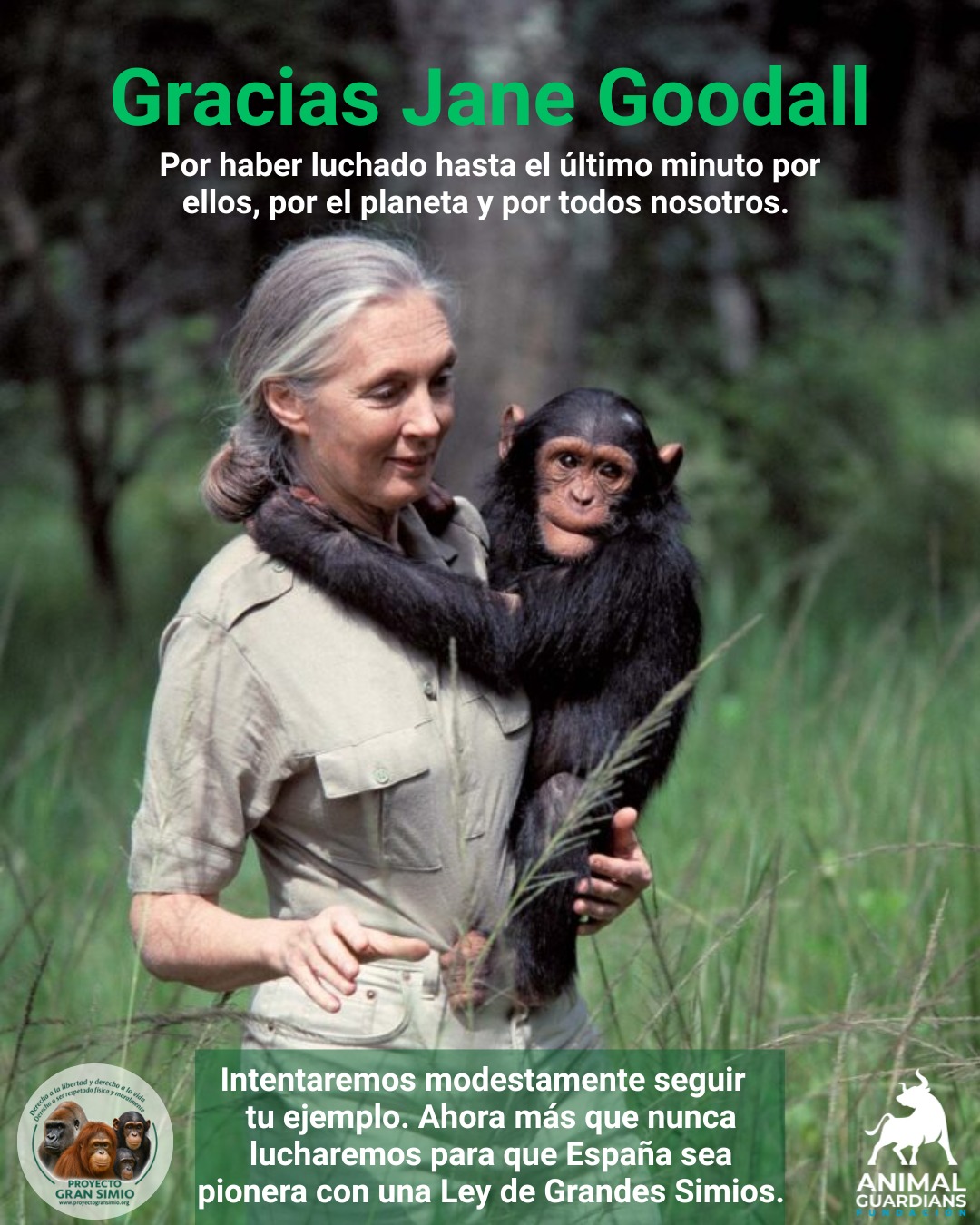 Por haber dado hasta tu último aliento por ellos, por el planeta y por todos nosotros, gracias, Jane. Intentaremos modestamente seguir tu ejemplo. Ahora más que nunca lucharemos para que España sea pionera con una Ley de Grandes Simios.”