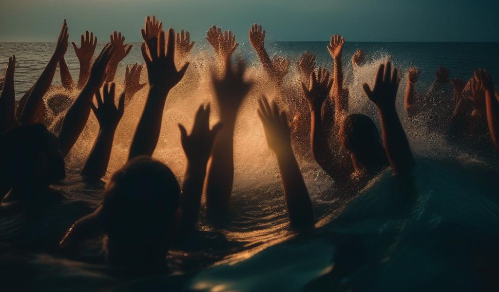 De las aguas profundas se levantan manos pidiendo ayuda, gritos callados y ahogos de esperanzas truncadas y olvidadas. Cuando las estrellas reflejan su luz en las oscuras tinieblas de la noche, se oyen gritos cansados, tiemblan las olas enmudecidas y la espuma se convierte en sangre de inocentes, en el olvido, en llanto, donde voces infantiles buscan la sonrisa perdida de sus labios.